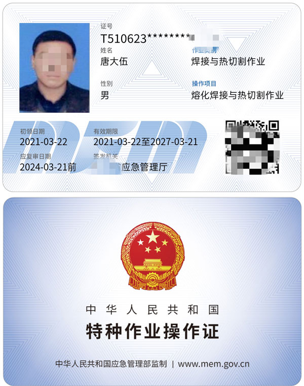特種作業(yè)操作證:作業(yè)種類:電工(俗稱操作證、上崗證),分類: 高壓運行維護(hù)作業(yè)、高壓安裝修造作業(yè)、低壓電工作業(yè)、安裝、維修、發(fā)電、配電。新版中華人民共和國特種作業(yè)操作證樣本 ,復(fù)審為三年一審,