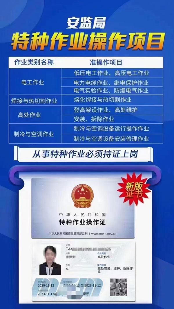 低壓電工操作證,高壓電工操作證,熔化焊接與熱切割作業(yè),焊工操作證,電力電纜,繼電保護,電氣試驗,防爆電氣作業(yè),高處安裝維護拆除作業(yè),登高架設作業(yè),制冷與空凋設備運行操作作業(yè),制冷與空凋設備安裝修理作業(yè),施工吊裝作業(yè),施工挖裝作業(yè),危化品負責人/管理人員,?;窂臉I(yè)人員上崗證。