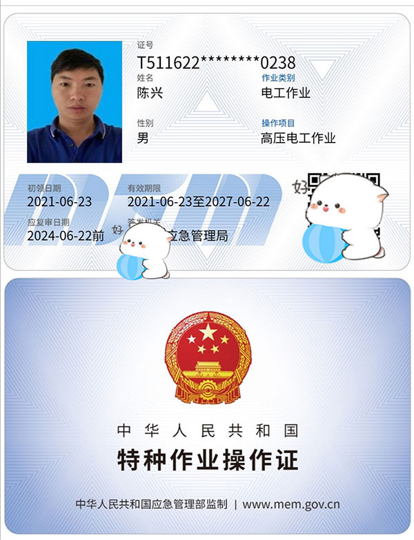 2、高壓電工證:是指對1千伏(KV)以上和10千伏(kv)以下的高壓電氣設備進行運行、維護、安裝、檢修、改造、施工、調試、試驗及絕緣工、器具進行試驗的作業。高壓電工入網操作證,又稱:電工進網作業許可證,是由能源局頒發,在用戶的受電裝置或者送電裝置上,從事電氣安裝、試驗、檢修、運行等作業的許可憑證?,F在能源局電工入網證統一跟換安監局高壓電工操作證。