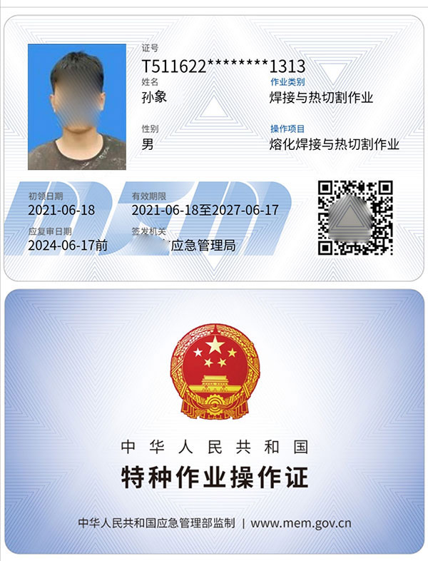焊工特種作業操作證,全國通用,聯網可查,是焊工從業人員必備的有效證件,證件有效期是6年,3年到期需要年審,6年滿了則需要換證,不管是復審還是換證,都建議大家提前2-3個月申請,以免過期作廢。