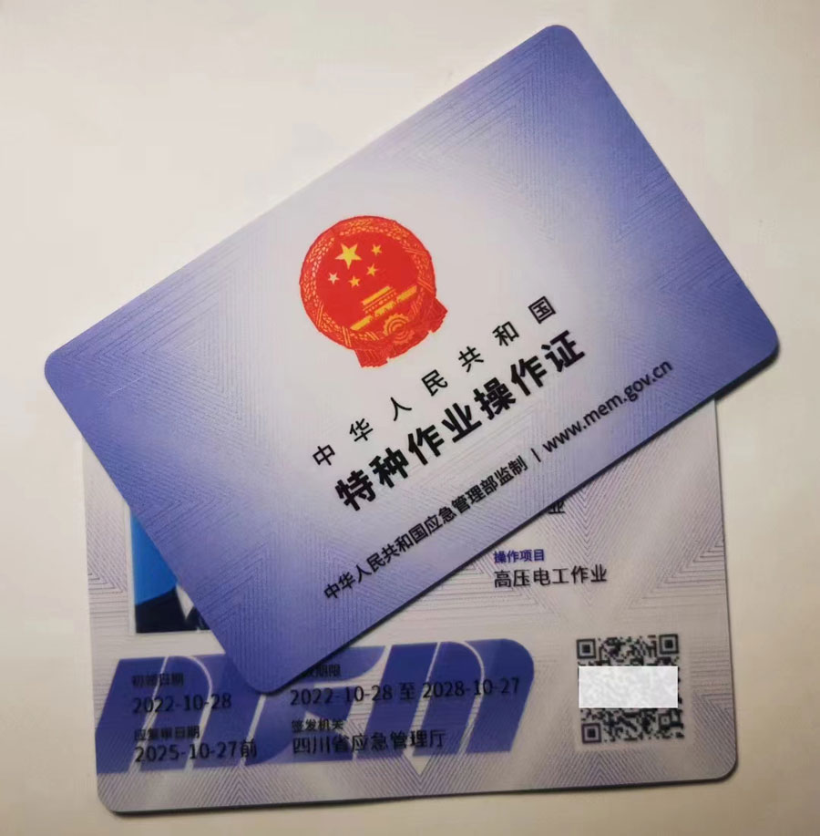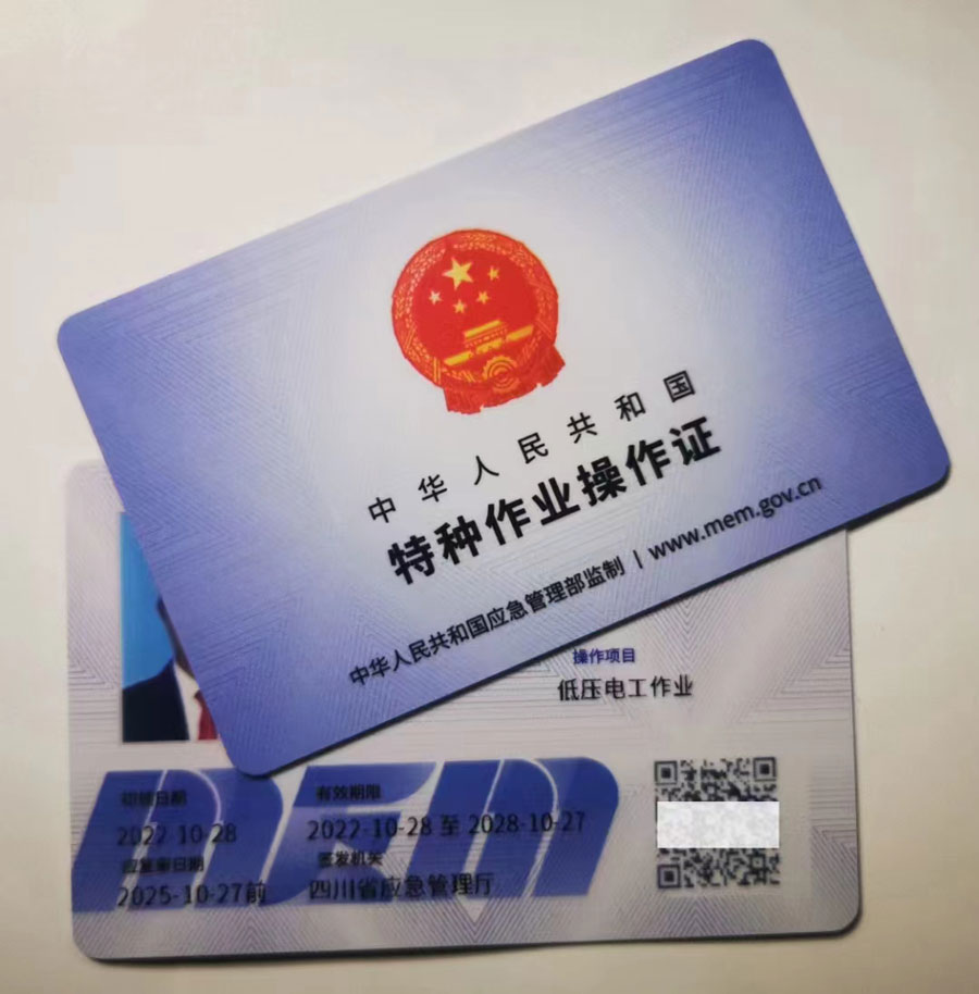 電工證(俗稱操作證、上崗證),分類:高壓運行維護作業、高壓安裝修造作業、低壓電工作業用于、安裝、維修、發電、配電, 電工證,焊工證等,高處安裝,登高架設作業,制冷與空凋設備運行操作作業,制冷與空凋設備安裝修理作業,電力電纜,繼電保護,電氣試驗,防爆電氣作業,特種作業人員必須經專門的安全技術培訓并考核合格,取得《中華人民共和國特種作業操作證》(以下簡稱特種作業操作證)后,方可上崗作業。